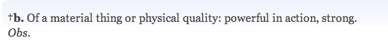 But the thing is, if you define “masculine” as “strong” and “powerful,” what’s left for “feminine?” The OED doesn’t come right out and say that “feminine” means weak, but they don’t have to. It’s already implied.