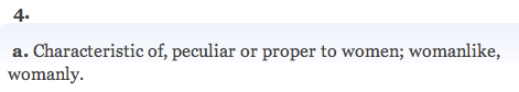 There you have it, folks. “Feminine” can be used as a derogatory term (which anyone who has been told they “throw like a girl” can tell you). And there are two synonyms offered, too! Must be a popular put-down. (And I have no idea what that question mark is doing in there, unless the OED is as shocked and confused as I am about all this stuff.)