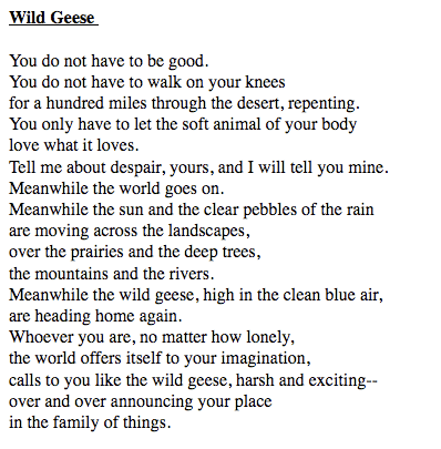 this is one of my favourite poems of all time. i love the line “you only have to let the soft animal of your body love what it loves”. heart-breakingly beautiful